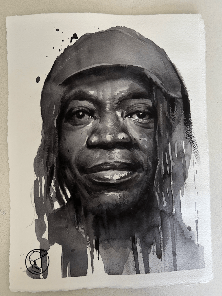 Apart from his tattoos, de Paiva mainly does striking portrays – of ordinary people like you and me just as much as of stars and celebrities in music and sports. “I have always been fascinated by drawing people. This has increased my artistic and technical repertoire“, de Paiva says. “A few years ago, I started to create my pieces and work more with line, to generate something more graphic, and until today I am still delighted with that.“ His art works convey a unique atmosphere and charisma. “I’m really looking for a visual identity that people will look at and say: Fernando Travis designed this. I invest a lot in trying to have a unique style“, he tells us. “Mostly I derive my inspirations from everyday life and music. I love music, maybe because I played drums for many years, so I value music artists a lot, and I dedicate myself a lot to listening to music while I paint.“ Among his collaborations is also the US-rapper Yelawolf for whom de Paiva designed the cover of his “Mud Mouth” album. But for de Paiva, it is not only about celebrity culture and fame, but also about the beauty in the faces we encounter every day. “I really like to portray people who are ordinary, who are present in everyday life – too often we don’t notice their beauty and particularities”, de Paiva says. “But of course I also like to paint people with a high media presence. I had the pleasure of working with some, Yelawolf is an example of an artist that I admire, and I did official work for him.“