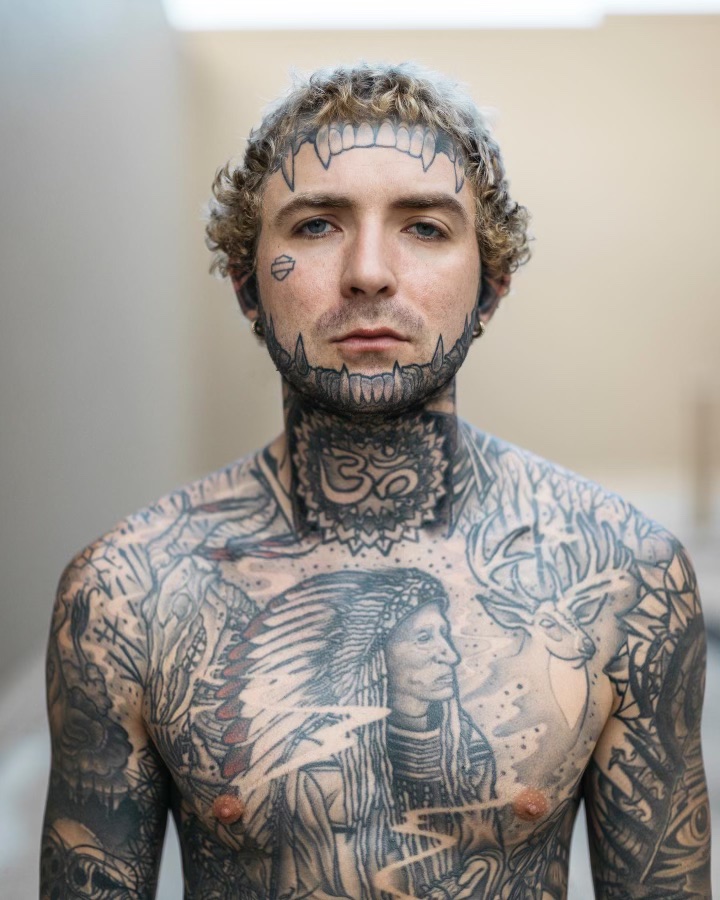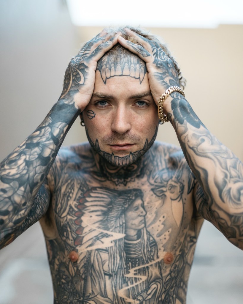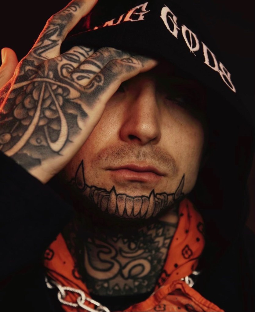 Alongside Caskey´s personal growth, his following has expanded and changed as well. “In the last couple of years, it has turned towards people that really care about improving their lives, want to put down vices they have, change in a positive way. These are getting a bigger portion of my fanbase. Before, it was just people that had been through the same stuff like me – drug-addicted counter-culture kids”, Caskey explains. “My brand has always been Blacksheep, the counterculture to the norm, tattoos, and living life on your terms. But over the years it has gotten more diverse and inclusive.” He recalls that on his last tour through the States with fellow rapper Yelawolf, there were fans from seven years to seventy years old. “You have to be the type of person that this” – he points to his striking face tattoos – “doesn’t scare off right away. It has the natural advantage of scaring away all the people that I don’t want to be part of this. Anybody that sees this, judges me and doesn’t want to have anything to do with me because of it – cool, this saved myself any inconvenience of talking to somebody like you”, Caskey grins. “Those are not the people I want to attract to my life anyways. But there is also the juxtaposition of looking this way and being somebody of value and intellect at the same time.” With his tattoos, he wants to defeat the stereotypes that are still put on hip hop and street culture. “I´m not the typical face-tat white kid that talks about popping percs and doesn’t care about life. I´m so the opposite of that. For people that are turned off by my tattoos initially, it´s this nice relief moment to just hear me say something of substance and value.”